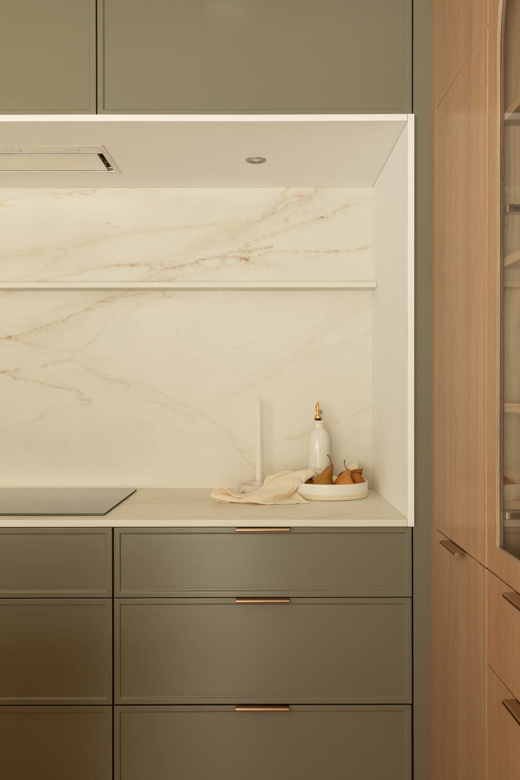 Careful details, such as porcelain or gilded metal handles, add a delicate, refined touch. Worktops in marble or unfinished wood add sophistication and warmth, while metallic elements, such as brass or copper, reinforce the warm, inviting look. English design also favours the use of open shelving, allowing crockery and accessories to stand out, while creating a more accessible, airy ambience. The style favours an intimate, welcoming atmosphere, where every element seems to have a story to tell, offering a kitchen that is both practical and full of charm.