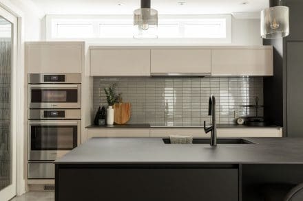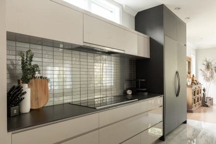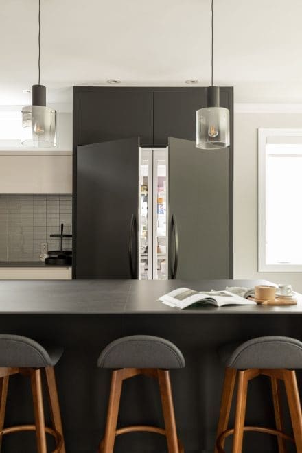 The central island, the centerpiece of the kitchen, was designed to accommodate five people and provide an incomparable work surface. The integration of a black sink, paired with tone-on-tone faucets, contributes to the space’s minimalist aesthetic. The Neolith Basalt Black countertop, with its satin finish and waterfall installation, adds a dimension of luxury and visual fluidity to the kitchen. This choice of material, both resistant and aesthetically pleasing, creates a practical and elegant work surface. Finally, the island also features a light integrated into the kick, adding a touch of originality and indirect lighting for a warm, friendly atmosphere.