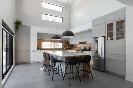 A second section of upper cabinets was added to provide additional storage capacity, while preserving the space’s minimalist style. The integration of two-level recessed lighting under the cabinets ensured adequate task lighting, creating a bright, customizable ambience. For their part, the cabinets were built with urban straight polyethylene doors in shades of grey (Warm Alpaca 08N) and white (Gloss White P601). The combination of gloss and matte finishes allowed us to create a subtle play of textures and contrasts.