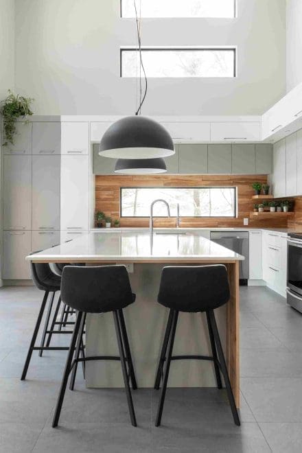 For the St-Denis kitchen project, we focused on an aesthetic that was both contemporary and functional. The high ceilings of this new project were exploited to create a feeling of space and expansiveness, contributing to the airy, welcoming atmosphere.