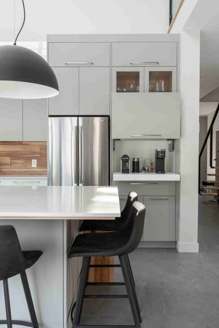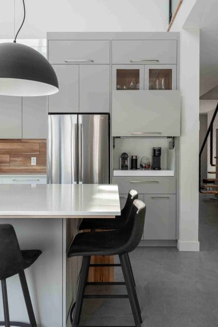 The central island played a key role in the design of this gathering place, providing a convivial space for up to five guests. Vicostone’s Crystal Ivory quartz countertops contributed to the timeless elegance of the space, making this kitchen an ideal place to prepare meals while socializing with family and friends. A little further on, a coffee corner has been concealed behind a parallel door opening upwards to provide a dedicated space to hide small kitchen appliances. The sliding shelf provides full access, and the electrical socket at the rear allows appliances to be plugged in, while preserving the kitchen’s minimalist aesthetic.