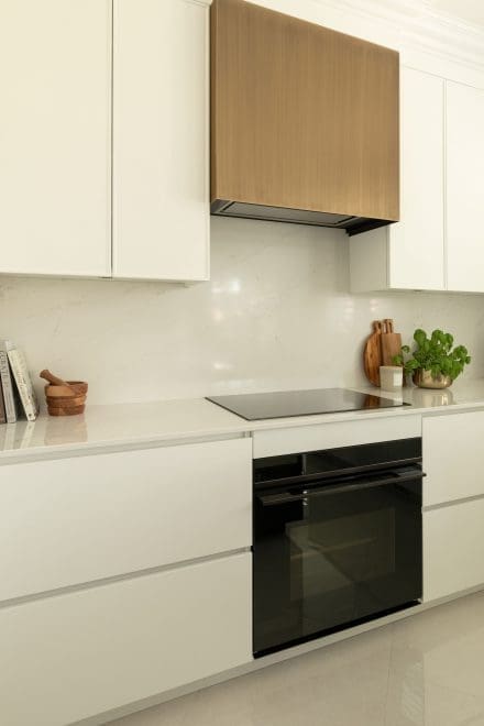 At the heart of the composition, the bronze metal hood stands out as a centrepiece. Its matte sheen and golden hue introduce a warm accent that coordinates with the golden handles integrated into the kitchen. These details are a subtle nod to contemporary design codes.