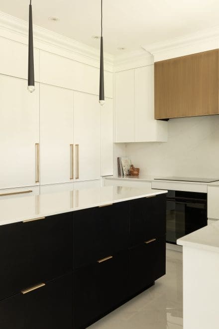 The St-Dié kitchen, with its transitional style, strikes a balance between classic elements and a contemporary approach. The contrasting colours in this kitchen discreetly define the space while adding depth. The materials have been carefully selected to offer a functional experience.
