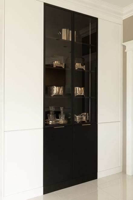 The pure white Urbaine and Roma door models bring a soft, timeless clarity. Their smooth surface naturally reflects light and amplifies the feeling of space. The glass-fronted dresser and black-stained wood island add warmth to the kitchen.