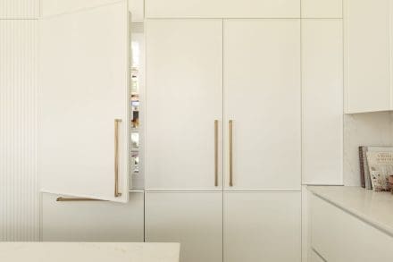 On the technical side, the choices also reflect a consistent approach: integrated appliances, invisible runners, discreet LED lighting, interior display cabinets, and custom organization. Each element is designed to blend discreetly into the whole, highlighting the clean lines of the composition.
