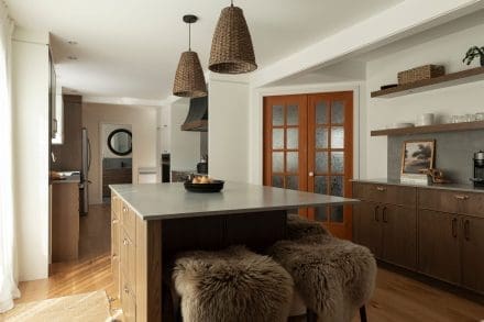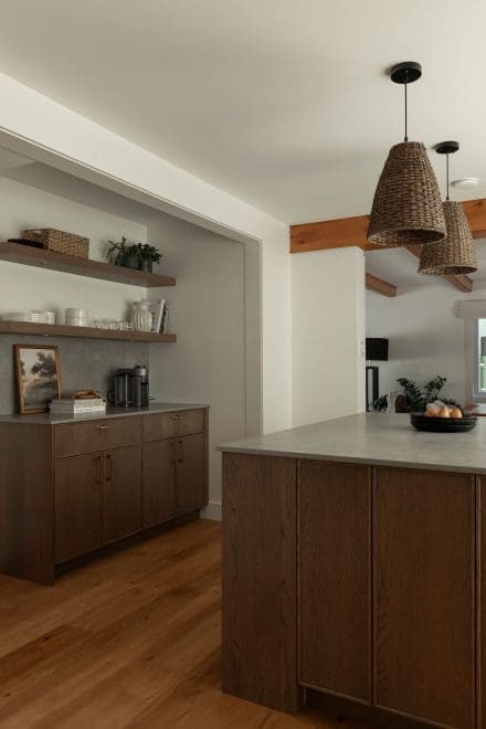 A coffee area has also been created, designed as a place to take a break during the day. Framed by two wooden shelves and a mineral backsplash, it exudes a soothing atmosphere that blends in with the main design.