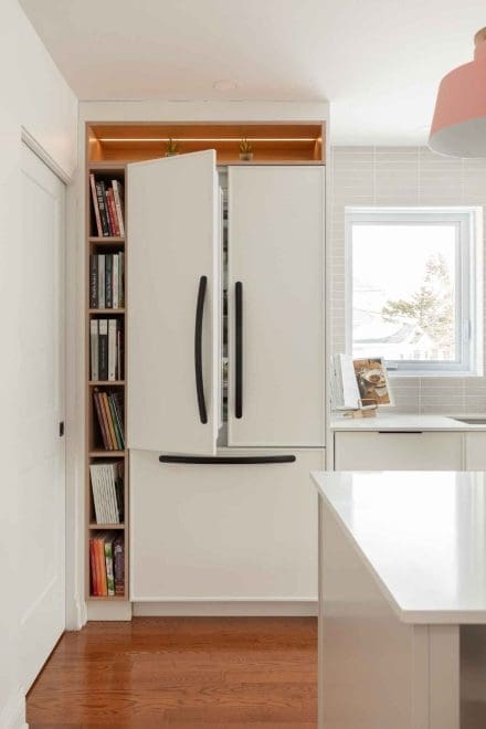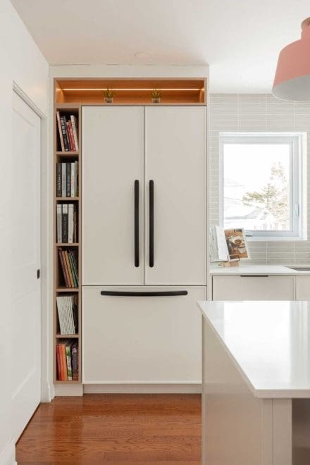 The slim shaker-style cabinets add a timeless touch to the ensemble, with their clean lines and contrasting black hardware, capturing the essence of contemporary design. The refrigerator, concealed behind doors harmoniously matched to the décor, becomes a discreet centerpiece, surrounded by niches dedicated to the cookbook collection, adding a personal touch to the space.
