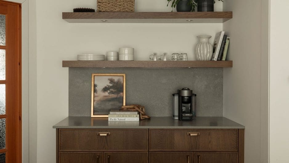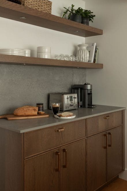 Souvent équipé d’un petit comptoir ou d’une surface dégagée, il permet de regrouper les essentiels du matin : cafetière, bouilloire, grille-pain ou encore vaisselle fréquemment utilisée. Pour le rendre encore plus efficace, on privilégie des rangs de rangement à proximité : des armoires fermées pour les accessoires moins esthétiques, et des étagères ouvertes pour exposer tasses, bols ou éléments décoratifs.