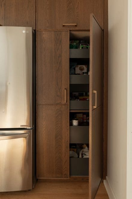De son côté, le garde-manger doit être aménagé de manière intelligente : des étagères réglables, des tiroirs coulissants ou encore des paniers modulables facilitent le rangement et la visibilité des aliments secs, conserves et épices.