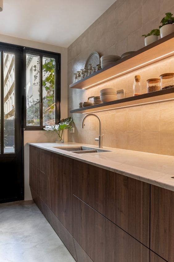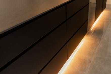 L’éclairage d’appoint, qu’il s’agisse de spots encastrés sous les armoires hautes ou de bandes LED, anime de manière subtile les jeux d’ombres et de lumière, créant une ambiance lumineuse envoûtante lors des moments plus sombres. Il devient le complice des soirées conviviales et des instants de détente, ajoutant une note de chaleur supplémentaire à l’espace.