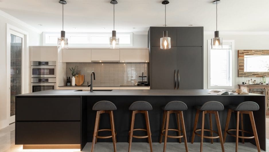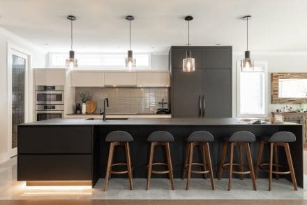 Créateur d’atmosphère confortable par excellence, l’éclairage d’ambiance est utilisé pour générer un environnement feutré et élégant. Il peut être ajusté pour créer différentes ambiances en fonction des besoins et des occasions, que ce soit pour un souper en tête à tête ou une soirée gourmande. Le jeu subtil d’ombres et de lumière prend vie à travers les caissons vitrés est une tendance 2024 qui se dessine en ce moment, notamment grâce au verre flûte. On retrouve aussi de l’éclairage d’appoint sous les contours des comptoirs, en suivant le déroulement des coups-de-pieds d’armoires et en soulignant les contours des tablettes décoratives. Il se fait complice de votre quotidien, apportant une touche de chaleur supplémentaire à l’espace.
