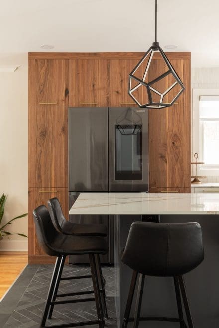 Le mélange des textures et des couleurs crée une ambiance harmonieuse. Les armoires pleine hauteur faites de placage de noyer naturel ajoutent une touche de chaleur, tandis que les façades inférieures en gris bleu offrent un contraste moderne. Ce ton subtil, à mi-chemin entre le gris neutre et le bleu feutré, apporte une note élégante et originale à la pièce. Leur finition mate met en valeur la sobriété du design, tout en ajoutant de la profondeur à l’espace.