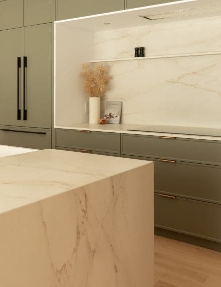 D’autre part, au centre de cette cuisine, on y retrouve un îlot multifonctionnel et une surface de comptoir en Dekton. Ce matériau hautement résistant évoque le marbre avec ses tracés fins dorés et gris, mais conserve une élégance adaptée au quotidien. Utilisé aussi pour le dosseret, il offre une continuité visuelle apaisante, tout en étant facile d’entretien.