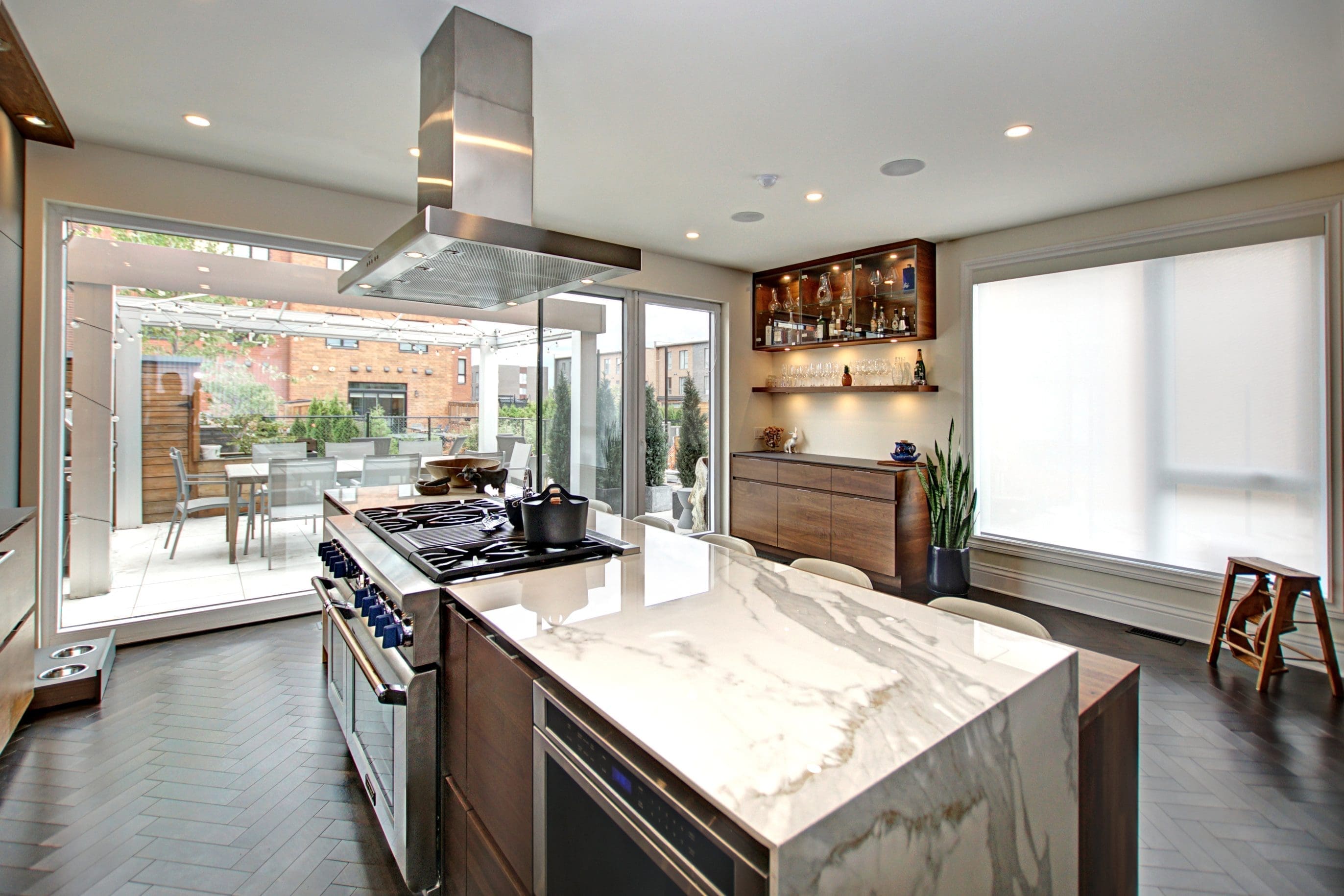 La cuisine contemporaine doit être conçue avec des lignes très épurées et très droites. Aucun angle ni courbe ne seront tolérés. On pourrait pratiquement dire que l’allure tend vers la cuisine moderne. Au niveau des armoires de la cuisine contemporaine, le bois demeure très populaire et d’ailleurs, le chêne effectue un retour en force. On retrouve aussi de plus en plus de plaqué et de portes d’armoires en MDF. Tous ces matériaux reviennent dans les cuisines contemporaines, mais on va souvent les peindre avec des couleurs populaires foncées comme le noir, le bleu et le gris. Les armoires de cuisine contemporaine sont encore très minimalistes, c’est-à-dire qu’on ne retrouvera pas de moulure ni de finition particulière.