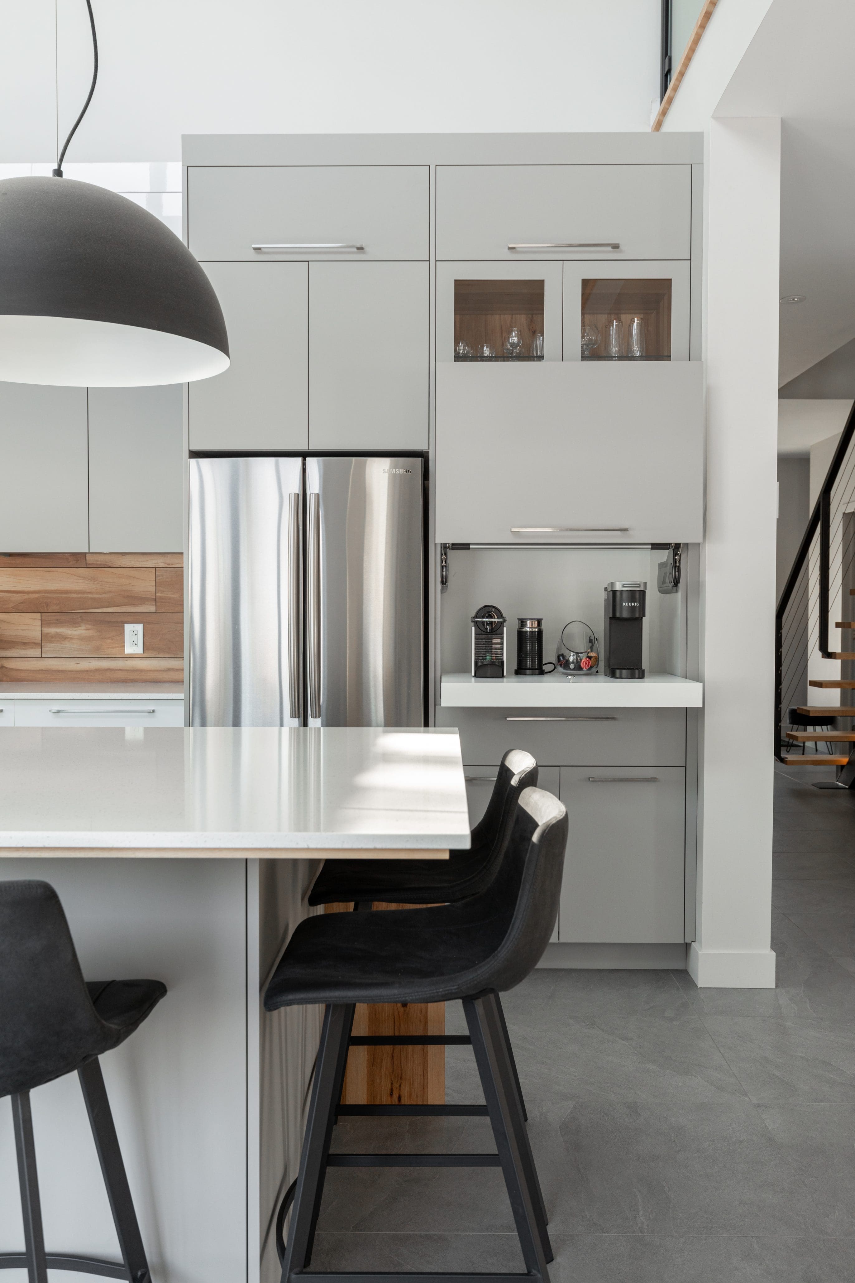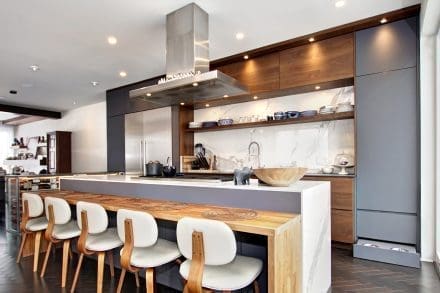 Lorsque nos cuisinistes conçoivent une cuisine contemporaine, ils proposent l’utilisation de deux et même trois types de matériaux différents. Évidemment, comme il est très tendance actuellement, le bois sera souvent utilisé. On retrouvera un bois plutôt brut avec des nœuds et des imperfections ce qui nous donne un petit sentiment de forêt, de plein air et de nature. En plus de l’utiliser pour la cuisine en tant que telle, une cuisine contemporaine peut utiliser le bois au plafond. En effet, plusieurs cuisinistes proposeront d’installer des poutres de bois en pruche au plafond pour donner un effet encore plus chaleureux et convivial à cet espace de vie afin que les gens puissent se sentir confortables.